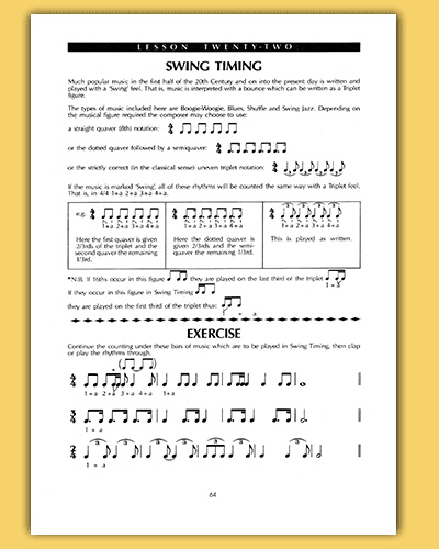 Single, Double and Triple Dotted Noted; 64th and 128th notes and rests; Breve or Double Whole Note; the alternative Crotchet (1 /4) rest; Syncopation; Swing Timing.