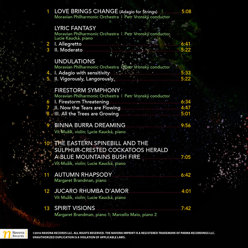 In the central orchestral piece, the programmatic three-movement Firestorm Symphony for full orchestra, Margaret Brandman effectively captures the shimmering heat, dangerous wind and approaching fire along with the sounds of the native birds, during the terrifying experience of Australian Blue Mountains' bush fires which threatened her family home, the sorrowful aftermath and eventual renewal of the bush.