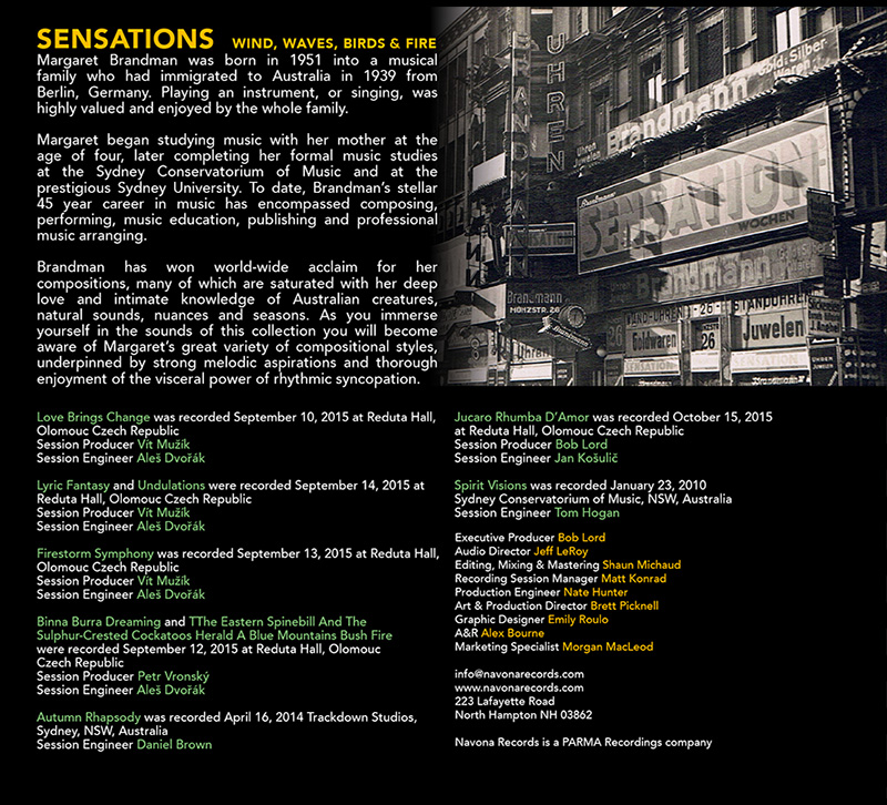 Australian composer, music educator, and pianist Margaret Brandman presents her debut Navona release SENSATIONS, featuring several of her celebrated compositions, each one presenting a unique musical experience and sensation.