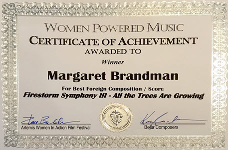 Firestorm Symphony (III) 'All the Trees are Growing' won the BEST FOREIGN COMPOSITION AWARD at the ARTEMIS FILM AWARDS in Los Angeles April 25-28 2019 Margaret Brandman travelled to LA, California, to receive the award.